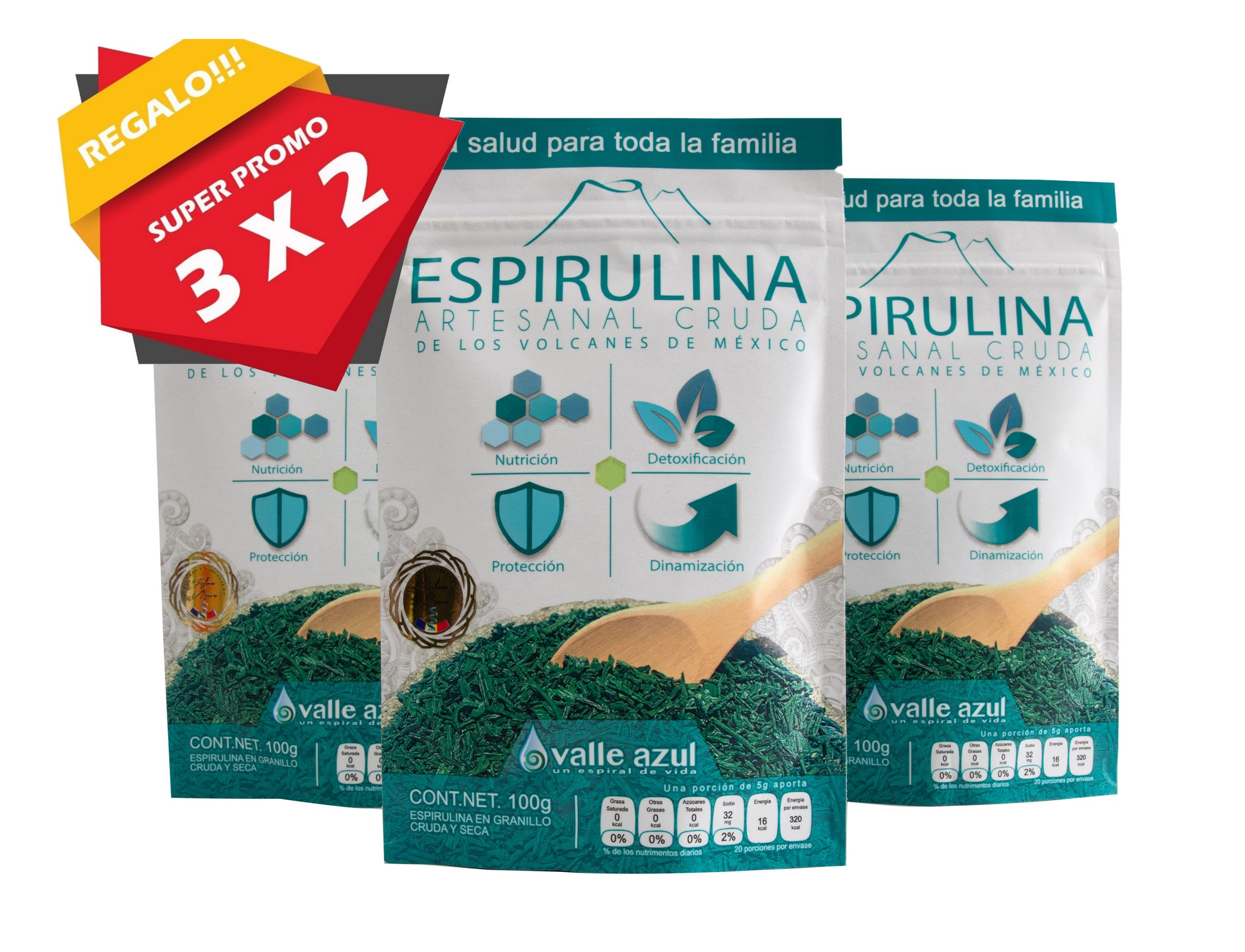 - 3 Paquetes de 100gr de Espirulina Cruda en granillo.